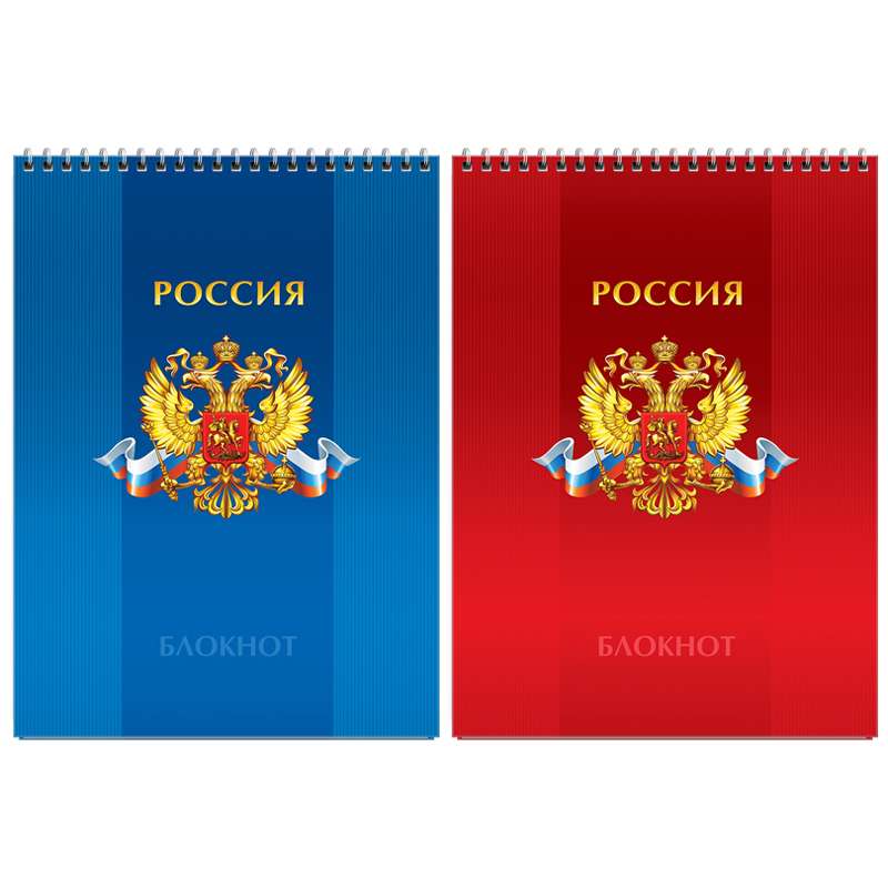 Блокнот формата А4, 80 листов, в твердой обложке с глянцевой ламинацией. Внутренний блок - белая офсетная бумага плотностью 55 г/кв.м, в клетку без полей.Блокнот А4 80л. на гребне "Российская символика", твердая обложка