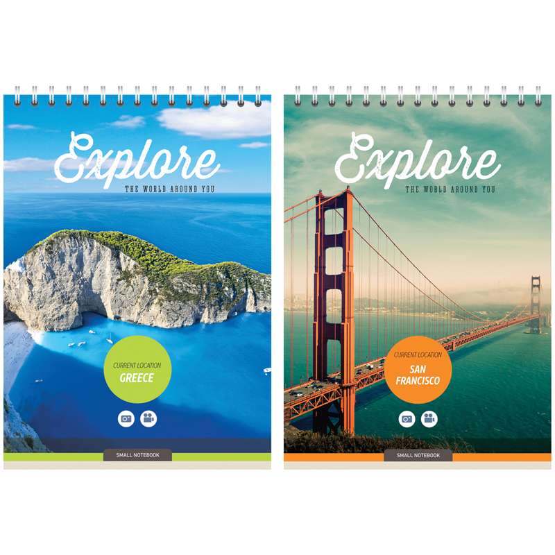 40 листов. Обложка – мелованный картон. Внутренний блок – офсет 60 г/м2, клетка. Формат А5. Крепление – евроспираль.Блокнот А5 40л. на гребне "Путешествия. Explore", эконом