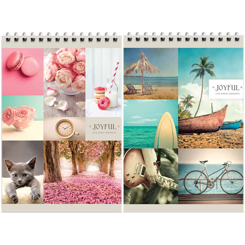 Блокнот из 40 листов. Обложка – мелованный картон. Внутренний блок – офсет 60 г/м2, клетка. Формат А5. Крепление – евроспираль.Блокнот А5 40л. на гребне "Стиль. Joyful. Great moments", эконом