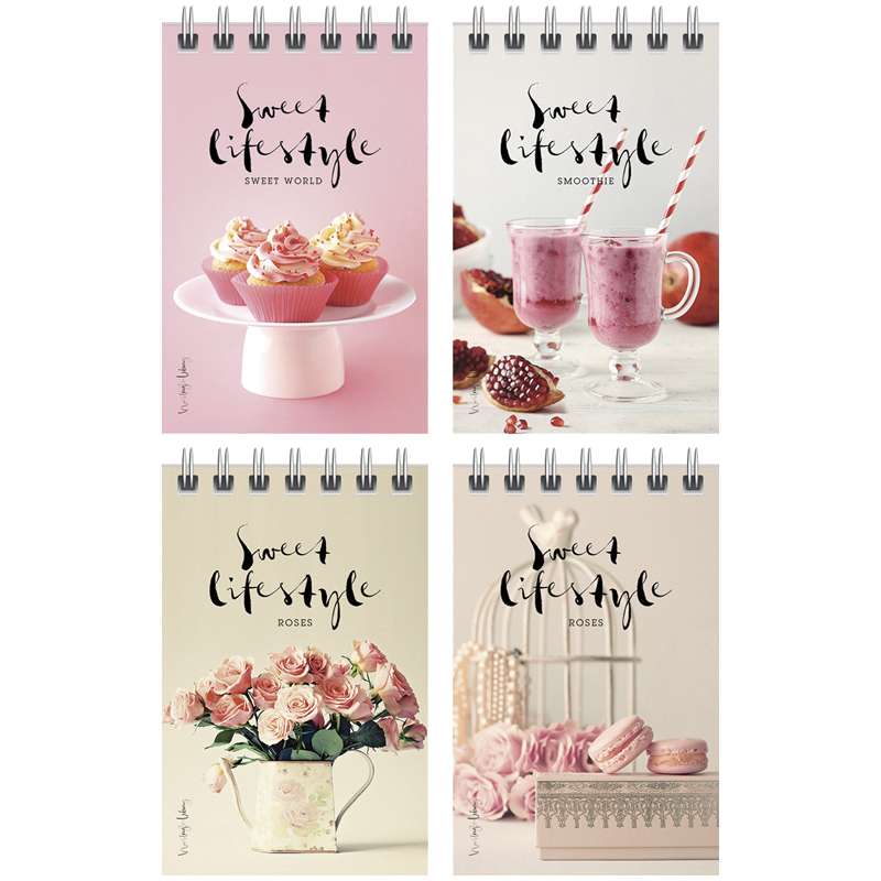 Внутренний блок – офсет 60 г/м². Обложка – мелованный картон, ВД-лак. Объем блока – 40 листов, клетка. Формат А7Блокнот А7 40л. на гребне "Стиль. Sweet lifestyle"