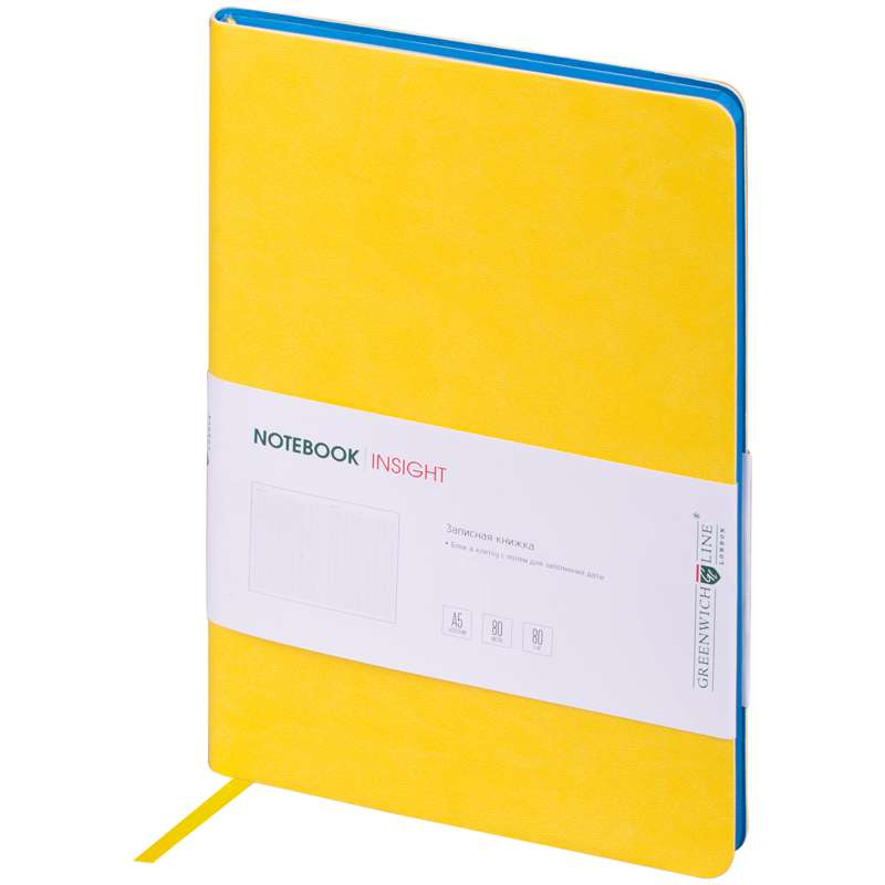 Стильная записная книжка с ярким цветным контрастным срезом и ультра-мягкой обложкой из 2 слоев высококачественного кожзаменителя. Внутренний блок из высокачественной тонированной офсетной бумаги повышенной плотности 80 г/м², клетка, пантонная печать. Прошитый блок. Закладка-ляссе в цвет обложки. Индивидуальная упаковка. Подходит под персонализацию.Записная книжка А5 80л. ЛАЙТ, кожзам, "Insight", желтый, тонир.блок, ляссе, цв.срез-синий