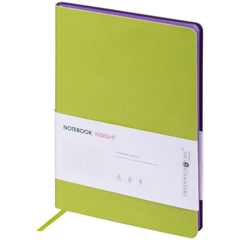 Стильная записная книжка с ярким цветным контрастным срезом и ультра-мягкой обложкой из 2 слоев высококачественного кожзаменителя. Внутренний блок из высокачественной тонированной офсетной бумаги повышенной плотности 80 г/м², клетка, пантонная печать. Прошитый блок. Закладка-ляссе в цвет обложки. Индивидуальная упаковка. Подходит под персонализацию.Записная книжка А5 80л. ЛАЙТ, кожзам, "Insight", салатовый, тонир.блок, ляссе, цв.срез-сиреневый