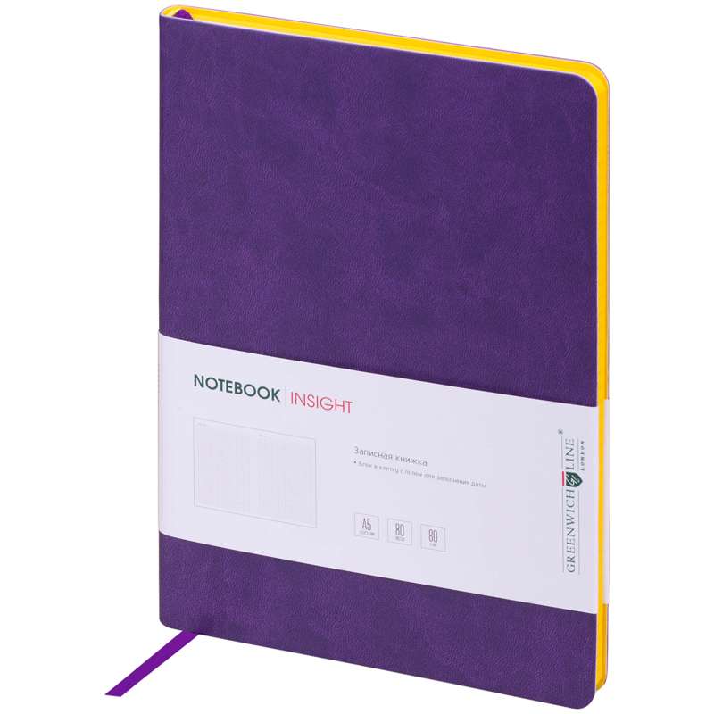 Стильная записная книжка с ярким цветным контрастным срезом и ультра-мягкой обложкой из 2 слоев высококачественного кожзаменителя. Внутренний блок из высокачественной тонированной офсетной бумаги повышенной плотности 80 г/м², клетка, пантонная печать. Прошитый блок. Закладка-ляссе в цвет обложки. Индивидуальная упаковка. Подходит под персонализацию.Записная книжка А5 80л. ЛАЙТ, кожзам, "Insight", сиреневый, тонир.блок, ляссе, цв.срез-желтый