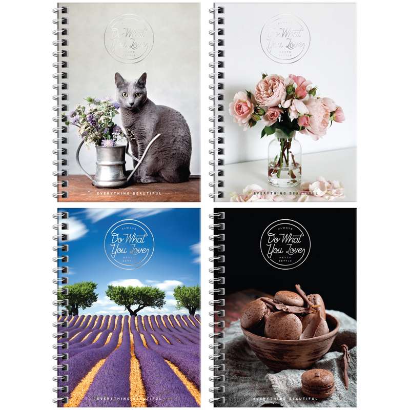 Записная книжка формата А6, 120 листов, в твердой обложке с глянцевой ламинацией. Внутренний блок - белая офсетная бумага плотностью 60 г/кв.м, в клетку без полей.Записная книжка А6 120л. на гребне "Стиль. Do what you love", глянц. лам, фольга, твердая обложка