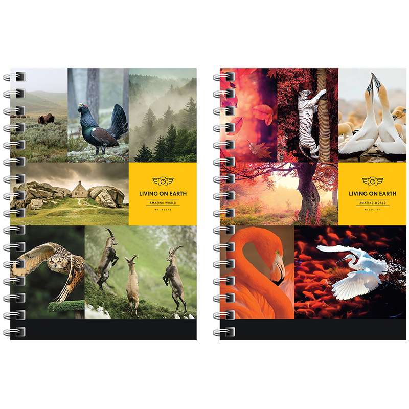 Формат А6. Вид крепления -гребень. Обложка -мелованный картон. Внутренний блок -офсетный, клетка, 60 г/мЗаписная книжка А6 140л. на гребне "Животные. Living on earth"