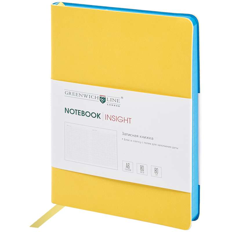 Стильная записная книжка с ярким цветным контрастным срезом и ультра-мягкой обложкой из 2 слоев высококачественного кожзаменителя. Внутренний блок из высокачественной тонированной офсетной бумаги повышенной плотности 80 г/м², клетка, пантонная печать. Прошитый блок. Закладка-ляссе в цвет обложки. Индивидуальная упаковка. Подходит под персонализацию.Записная книжка А6 80л. ЛАЙТ, кожзам, "Insight", желтый, тонир.блок, ляссе, цв.срез-синий