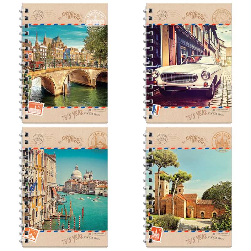Записная книжка формата А6, 96 листов, в твердой обложке с глянцевой ламинацией. Внутренний блок - белая офсетная бумага плотностью 55 г/кв.м, в клетку без полей.Записная книжка А6 96л. на гребне "Путешествия. Air mail", твердая обложка