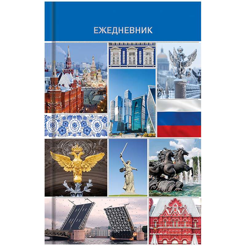 Незаменимый помощник для планирования встреч, звонков, переговоров. Отличный бизнес-аксессуар. Обложка - 7БЦ, украшена глянцевой ламинацией и тиснением серебряной фольгой. Удобный формат - А5. Прошитый переплет надежно держит блок. Офсетный блок белого цвета, объем - 136 листов.Ежедневник недатированный, A5, 136л. 7БЦ "Россия. Коллаж", глянцевая ламинация, тиснение фольгой