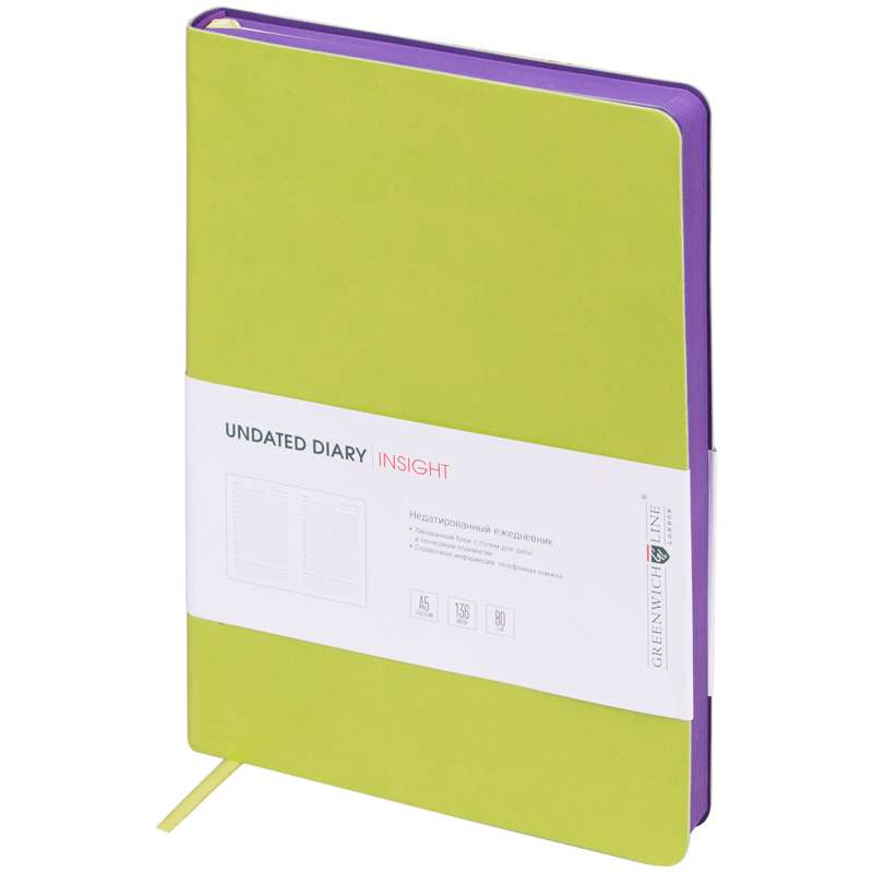 Главная / Товары / КАНЦТОВАРЫ / УПАКОВКА / ХОЗ ТОВАРЫ / РАСХОДНЫЕ МАТЕРИАЛЫ / Канцелярские товары - Офисные / Бумажная продукция для офиса / Деловое планирование / Ежедневники / Ежедневник недатированный, A5, 136л., кожзам, Greenwich Line "Insight", салатовый, сиреневый срез