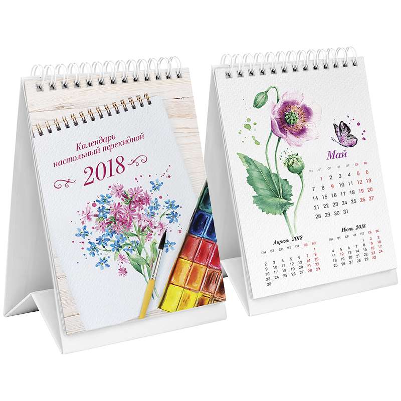 Календарь-домик настольный перекидной на 2018 год. Размер календаря – 105×170 мм. 8 листов. Календарная сетка на 3 месяца. Блок: • Материал – мелованная бумага. • Цветность – 4 краски. • Кол-во гребней – 1. Нижняя подложка: • Материал – картон. • Плотность – 320 гр/м2.Календарь-домик 105*170 мм "Акварель", на гребне, 2018г.