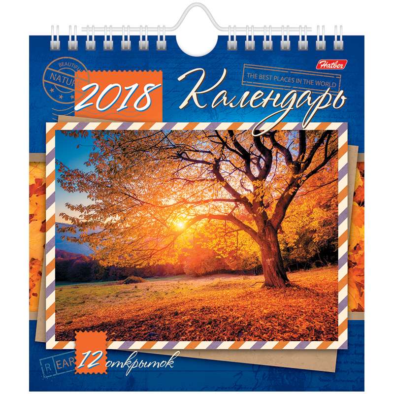 Календарь «POST с открытками» можно повесить на стену или поставить на стол. Для этого на подложке имеется специальная вырубная ножка-подставка. Каждую страницу календаря можно использовать как почтовую открытку, вырезав по линии предполагаемого края. Оборот каждого изделия оформлен в виде классической открытки. Имеется вырубная ножка-подставка на жесткой картонной подложке. формат/объем – 160х170 мм,13 листов крепление – гребень с ригелем (металлический стержень с петлей) обложка – мелованный картон 300 г/м2 блок – мелованный картон 300 г/м2, 12 открыток, УФ-лак с одной стороны упаковка – индивидуальная в термоусадочную пленку дополнительно – вырубная ножка-подставка на жесткой картонной подложкеКалендарь-домик "POST"- Пейзажи, на гребне, с открытками, с ригелем, 2018г.