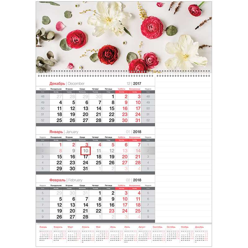 Календарь квартальный на 2018 год серия «Mono» 3 блока на 1-м гребне, с блоком для заметок. Размер календаря – 295×410 мм. Блок: • Материал – офсетная бумага. • Цветность – 2 краски. • Кол-во гребней – 1. Верхняя подложка: • Материал – картон. • Плотность – 350 гр/м2. • Цветность – полноцветная. Нижняя подложка: • Материал – картон. • Плотность – 320 гр/м2. • Цветность – 1 краска. Кол-во пикколо – 1. Кол-во бегунков – 1.Календарь кварт. 3 бл. на 1 гр. "Mono" - Цветочный блюз, с бегунком, блок для заметок, 2018 г.