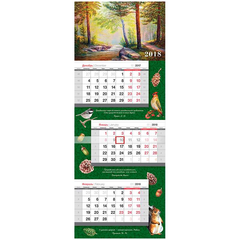 Календарь квартальный на 2018 год серия «Люкс каскад», 3 блока на склейке. Размер календаря – 245×649 мм. Блок: • Материал – офсетная бумага. • Крепление – склейка. Верхняя подложка: • Материал – картон. • Плотность – 350 гр/м2. • Цветность – полноцветный. Кол-во пикколо – 1. Кол-во бегунков – 1.Календарь кварт. 3 бл. на на склейке OfficeSpace "Люкс каскад" -Утро в лесу, с бегунком, 2018г.