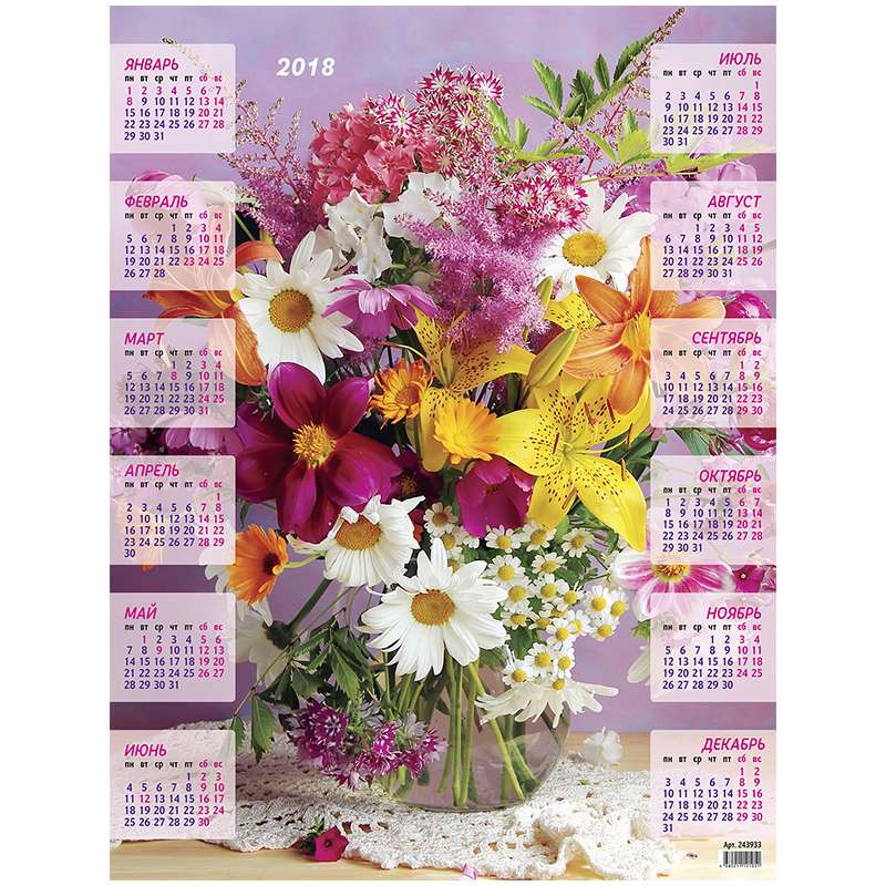Календарь настенный листовой на 2018 год. Размер календаря – 450×590 мм. Блок: • Материал – мелованная бумага. • Цветность – полноцветный.Календарь настенный листовой А2 "Летний букет", 2018 г.