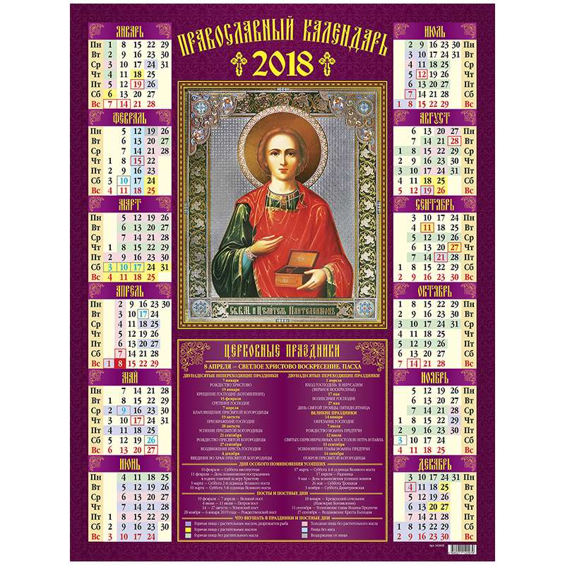 Календарь настенный листовой на 2018 год. Размер календаря – 450×590 мм. Блок: • Материал – мелованная бумага. • Цветность – полноцветный.Календарь настенный листовой А2 "Православный: Иконы", 2018 г.