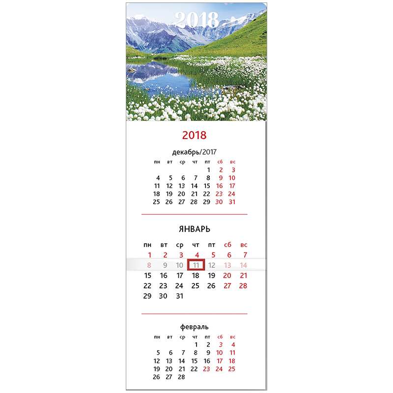 Календарь квартальный отрывной на магните на 2018 год. Размер календаря – 75×205 мм. Блок: • Материал – офсетная бумага. • Цветность – 2 краски. • Крепление - склейка Постер: • Материал – картон. • Цветность – полноцветная. Подложка: • Материал – картон. • Плотность – 380 гр/м2. • Цветность – однотонная.Календарь отрывной кварт. на магните 75*205мм, склейка, OfficeSpace "Горное озеро", бегунок, 2018