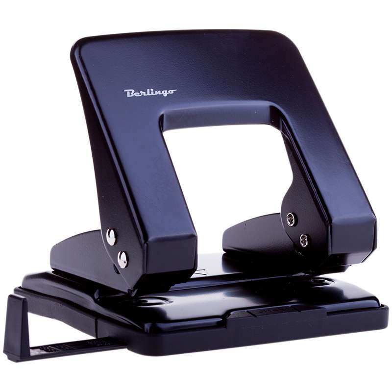 Дырокол позволяет перфорировать документы для последующей подшивки. Надежный механизм, острые ножи. Пластиковый поддон для конфетти. Блокировка для компактного хранения.Дырокол Berlingo 30л., металлический, черный, с линейкой