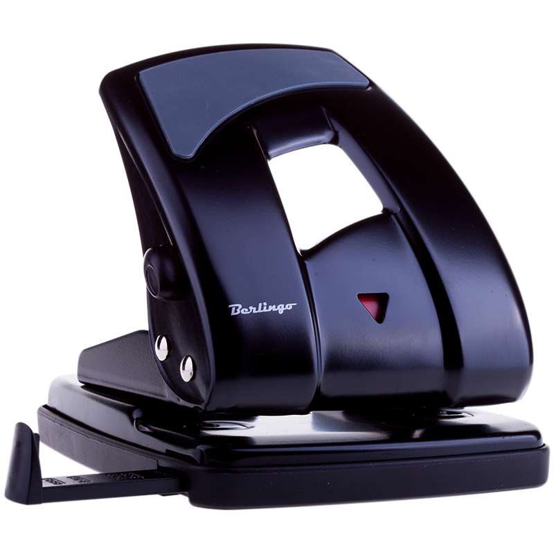 Цельнометаллический дырокол с антискользящей верхней накладкой. Дырокол позволяет перфорировать документы для последующей подшивки. Надежный механизм, острые ножи. Форматная линейка. Удобный пластиковый поддон для конфетти. На корпусе дырокола имеется метка для центрирования. Блокировка для компактного хранения. Упакован в картонную коробку. Пробивная способность до 40 листов.Дырокол Berlingo "Ultra" 40л, металлический, черный, с линейкой, европодвес