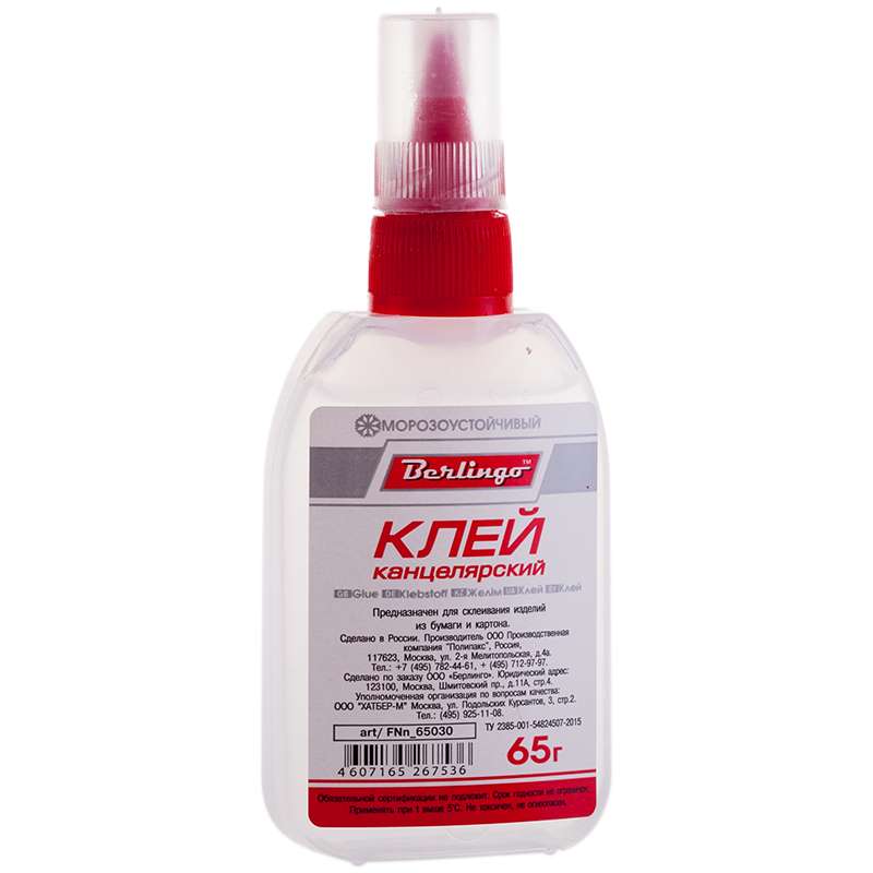 Канцелярский клей предназначен для склеивания бумаги, не оставляет следов и не коробит ее, после замораживания и размораживания не теряет своих свойств. Имеет удобный флакончик с дозатором, наносится точно и экономно.Клей канцелярский Berlingo, 65г
