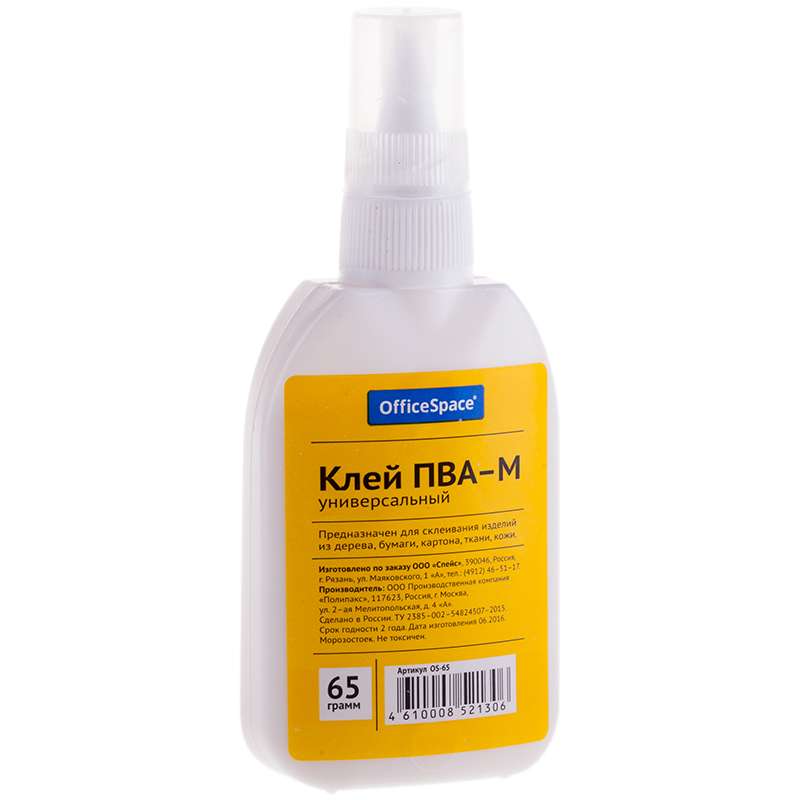 Предназначен для склеивания бумаги, картона, дерева. Закрывайте колпачком после использования.153192 Клей ПВА OfficeSpace 65г., с дозатором OS-65 [РЦ]