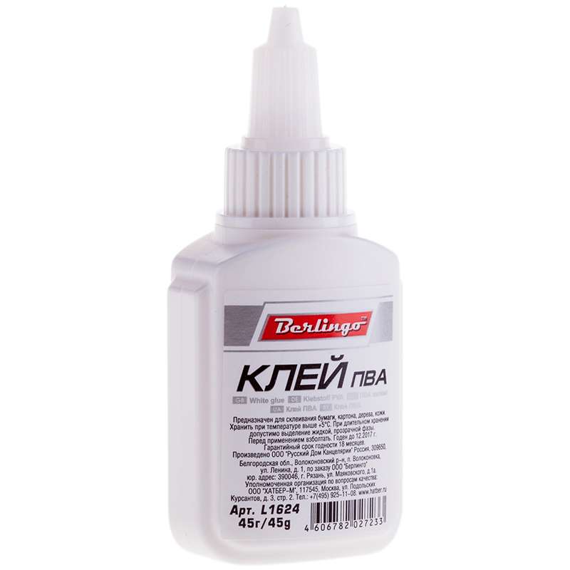 Для склеивания бумаги, картона, дерева, кожи. Не содержит растворителя. Не оставляет следов и легко смывается водой. Удобная пластиковая упаковка с экономичным дозатором. Клей устойчив к резким перепадам температур, выдерживает многократное замораживание и размораживание, сохраняя при этом однородность текстуры и потребительские свойства. Упаковка не деформируется при низких температурах.221931 Клей ПВА 45г. L1624 [РЦ]