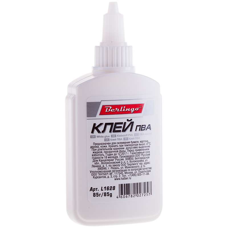 Для склеивания бумаги, картона, дерева, кожи. Не содержит растворителя. Не оставляет следов и легко смывается водой. Удобная пластиковая упаковка с экономичным дозатором. Клей устойчив к резким перепадам температур, выдерживает многократное замораживание и размораживание, сохраняя при этом однородность текстуры и потребительские свойства. Упаковка не деформируется при низких температурах.221933 Клей ПВА 85г. L1628 [РЦ]