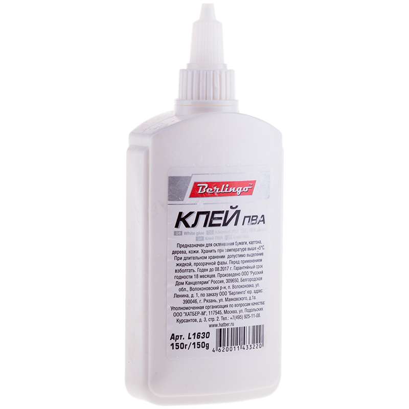 Для склеивания бумаги, картона, дерева, кожи. Не содержит растворителя. Не оставляет следов и легко смывается водой. Удобная пластиковая упаковка с экономичным дозатором. Клей устойчив к резким перепадам температур, выдерживает многократное замораживание и размораживание, сохраняя при этом однородность текстуры и потребительские свойства. Упаковка не деформируется при низких температурах.Клей ПВА Berlingo, 150г