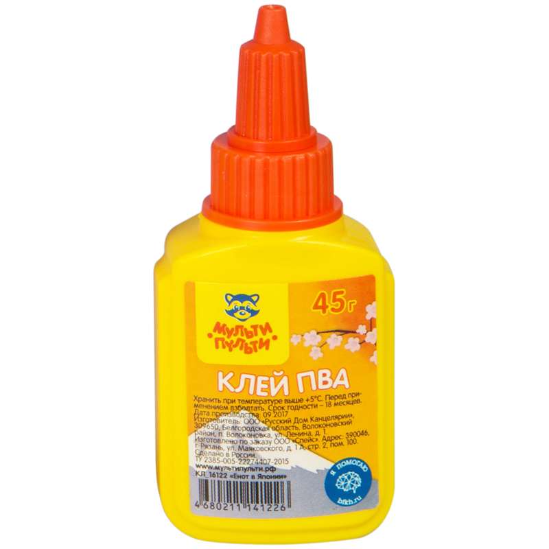 Клей ПВА Мульти-Пульти отлично подходит для создания поделок и работы на уроках труда. Хранить при температуре выше +5 С. Перед употреблением взболтать.Клей ПВА Мульти-Пульти "Енот в Японии", 45г