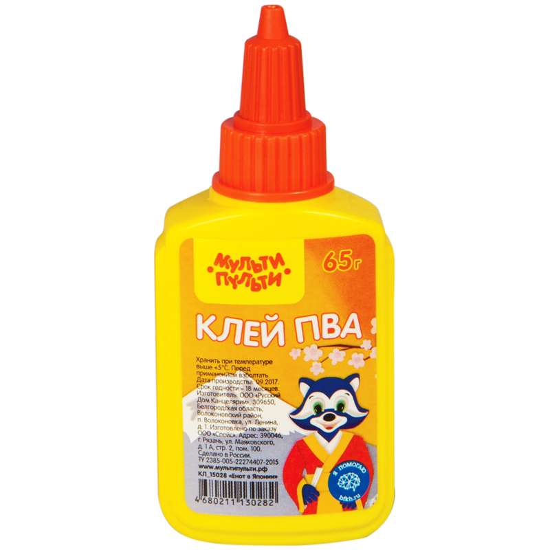 Клей ПВА Мульти-Пульти отлично подходит для создания поделок и работы на уроках труда. Хранить при температуре выше +5 С. Перед употреблением взболтать.Клей ПВА Мульти-Пульти "Енот в Японии", 65г