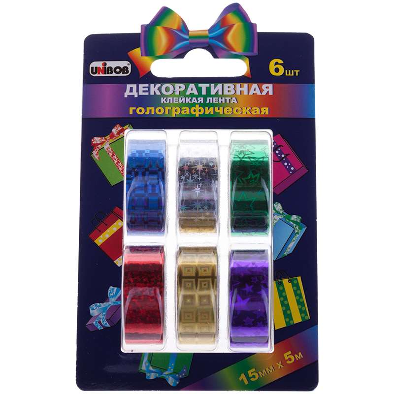 Набор из шести разноцветных голографических роликов декоративной клейкой ленты. Предназначен для скрапбукинга, оформления подарков, открыток и других дизайнерский работКлейкая лента декоративная 15мм*5м, Unibob, 6шт., разноцветная, голографическая
