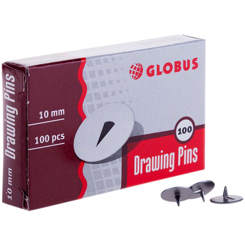 Металлические канцелярские кнопки. Размер кнопки - 10 мм. Упаковка в картонную коробочку по 100 шт.Кнопки канцелярские Globus, 10мм, 100шт., карт. упак.