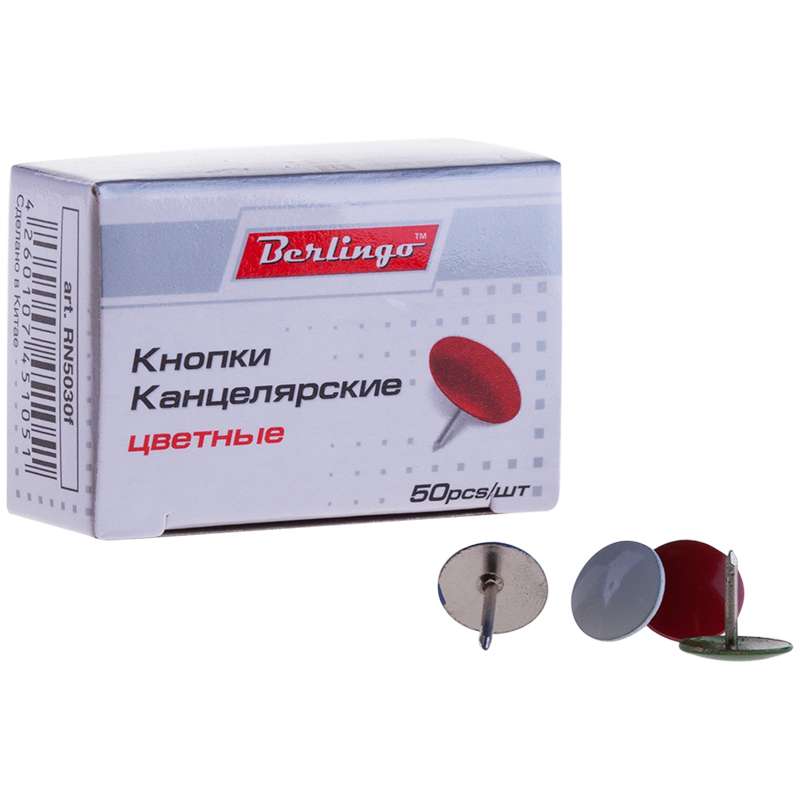Кнопки-гвоздики никелированные с цветными головками для надежного крепления бумаги. Диаметр - 10 мм, длина острия - 7 мм. Упаковка в картонную коробочку - по 50 шт.Кнопки канцелярские/гвоздики Berlingo, цветные 10мм, 50шт., карт. упак.