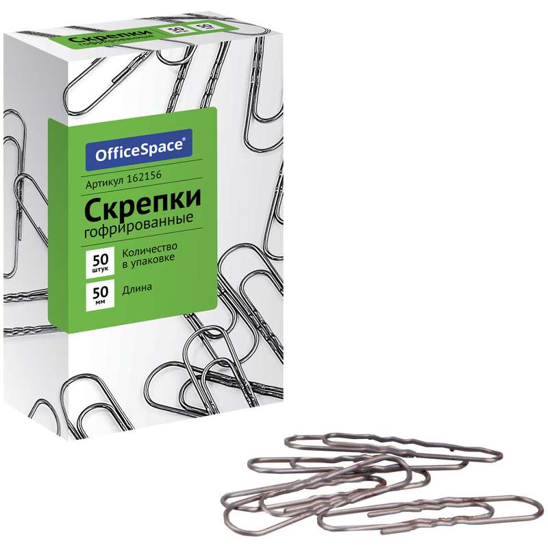Канцелярские скрепки стандартной круглой формы. Не ржавеют, не пачкают бумагу, обеспечивают надежное скрепление.162156 Скрепки 50мм, OfficeSpace, 50шт., гофрированные, карт. упак.162156 [РЦ]