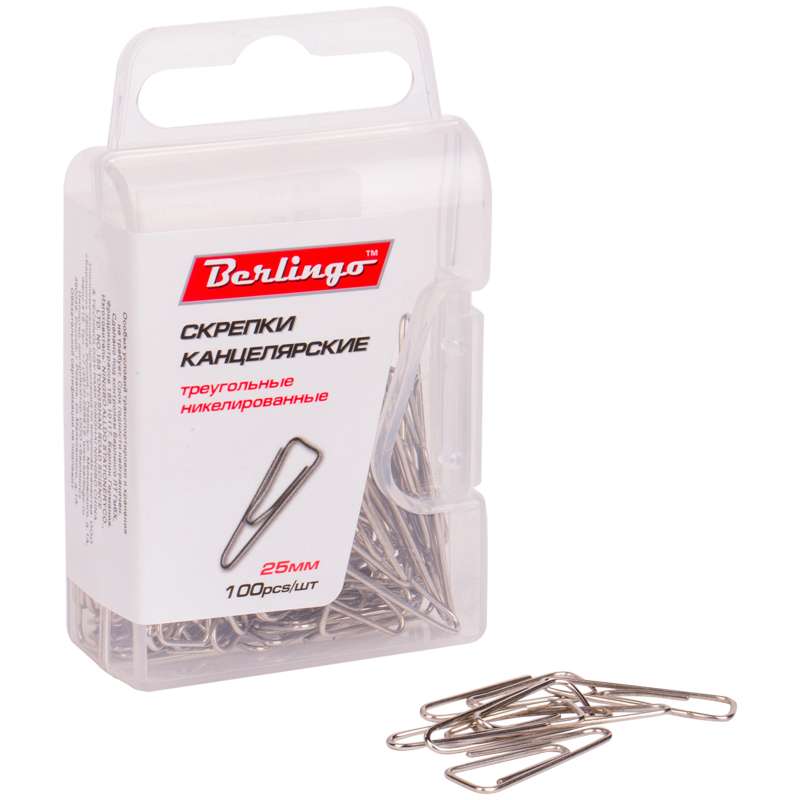 Никелированные канцелярские скрепки треугольной формы с отогнутым носиком. Не ржавеют, не пачкают бумагу, обеспечивают надежное скрепление. Упаковка в пластиковую коробочку с европодвесом - по 100 шт.Скрепки 25мм, Berlingo, 100шт., никелированные треугольные, пласт. упак., европодвес