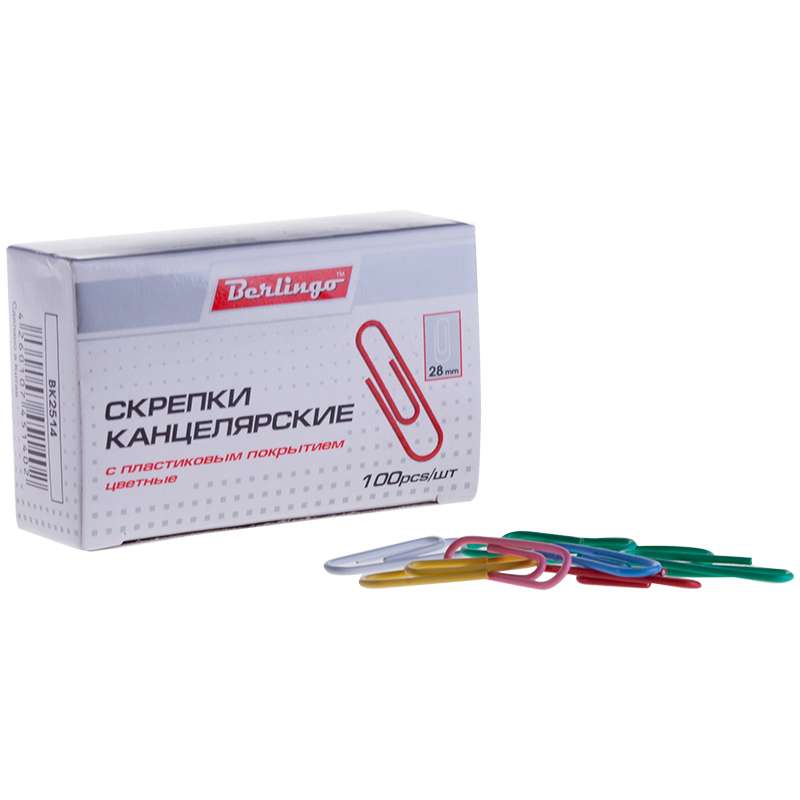 Металлические канцелярские скрепки с цветным виниловым покрытием. Не пачкают бумагу, не ржавеют, обеспечивают надежное скрепление. Упаковка в картонную коробочку - по 100 шт.Скрепки 28мм, Berlingo, 100шт., цветные, карт. упак.
