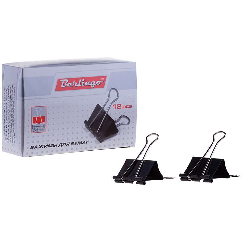 Надежно и легко скрепляют, не деформируют бумагу, не оставляют на ней следов. Упаковка в картонные коробочки по 12 шт. Цвет - черный.Зажимы для бумаг 51мм, Berlingo, 12шт., черные