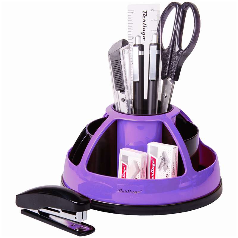 Главная / Товары / КАНЦТОВАРЫ / УПАКОВКА / ХОЗ ТОВАРЫ / РАСХОДНЫЕ МАТЕРИАЛЫ / Канцелярские товары - Офисные / Офисные принадлежности / Настольные приборы, подставки, лотки / Настольные наборы с наполнением / Настольный органайзер Berlingo "BR", 9 предметов, вращающийся, черный/фиолетовый
