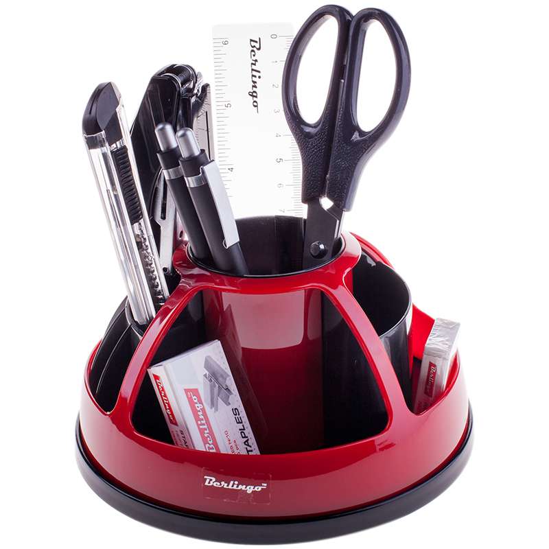 Главная / Товары / КАНЦТОВАРЫ / УПАКОВКА / ХОЗ ТОВАРЫ / РАСХОДНЫЕ МАТЕРИАЛЫ / Канцелярские товары - Офисные / Офисные принадлежности / Настольные приборы, подставки, лотки / Настольные наборы с наполнением / Настольный органайзер Berlingo "BR", 9 предметов, вращающийся, черный/красный