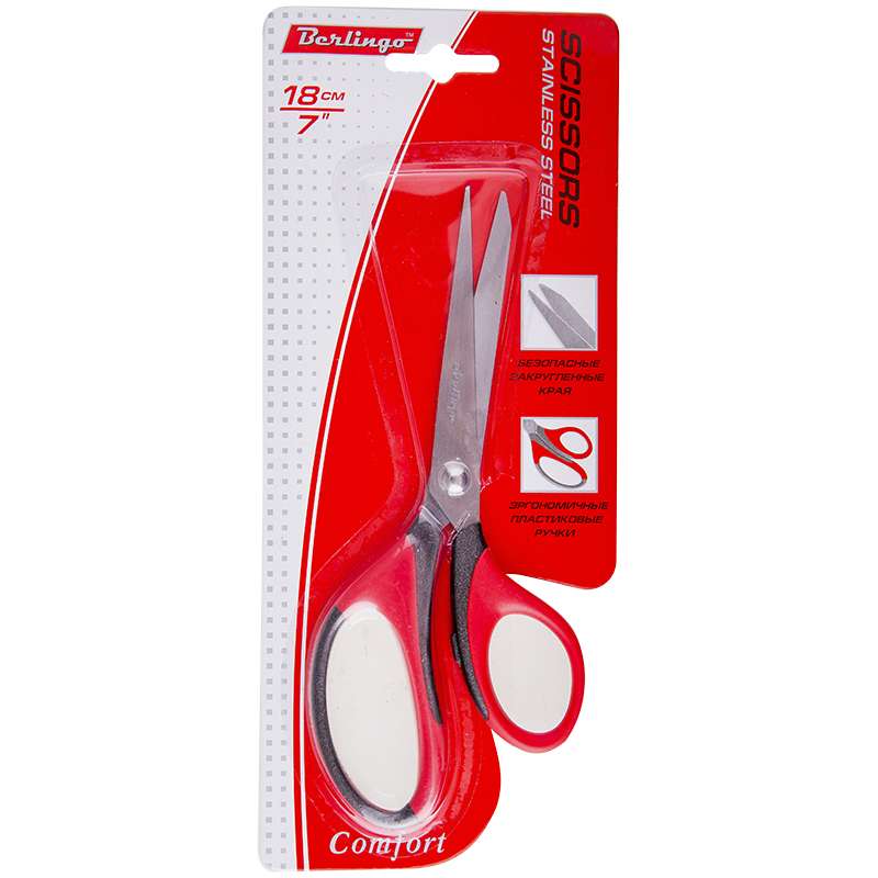 Подходят для использования в офисе, для ежедневной работы. Материал корпуса - нержавеющая сталь, ручки - пластик. Длина 18 см. Упаковка - блистер с европодвесом.Ножницы Berlingo "Comfort" 18см, эргономичные ручки, европодвес