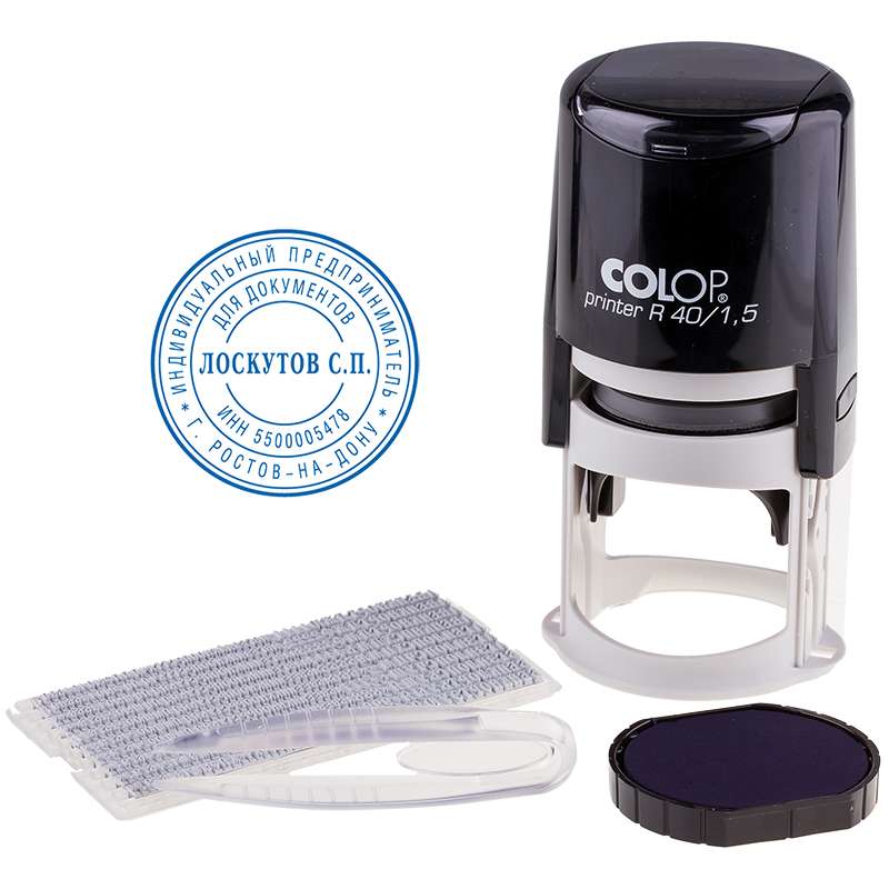 Самонаборная круглая печать на автоматической оснастке. В комплект входит пинцет, касса букв Typo Set A.Печать самонаборная автоматическая Colop, Ø40мм, 1,5 круга