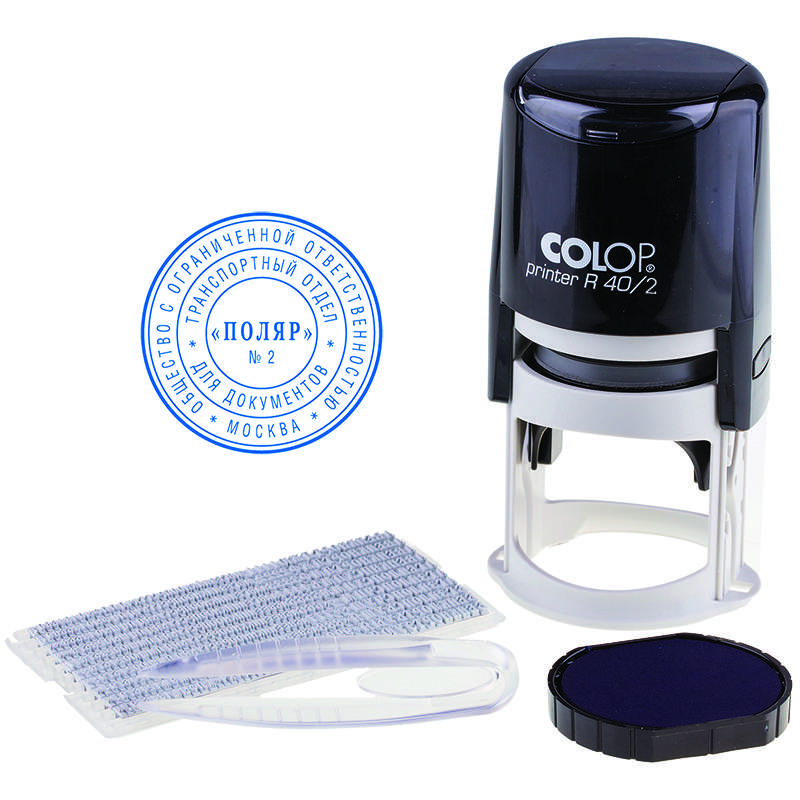Самонаборная круглая печать на автоматической оснастке. В комплект входит пинцет, касса букв Typo Set A.Печать самонаборная автоматическая Colop, Ø40мм, 2 круга