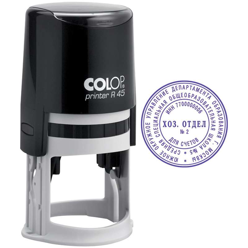 Самонаборная круглая печать на автоматической оснастке. В комплект входит пинцет, касса букв Typo Set A.Печать самонаборная автоматическая Colop, Ø45мм, 2,5 круга