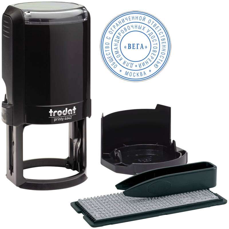 Самонаборная печать 2 круга. Наличие крышки позволяет переносить печать в сложенном виде. Интуитивно простая смена подушки, при которой пальцы всегда останутся чистыми. Долговечность, благодаря металлической втулке.Печать самонаборная автоматическая Trodat, Ø42мм, 2 круга
