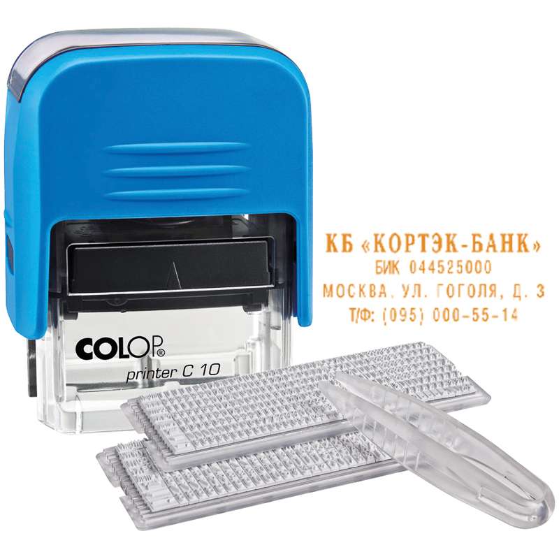 Самонаборный штамп. В комплект входит пинцет и касса букв и цифр. Символы крепятся на одной ножке. Материал корпуса штампа - пластик. Максимальное количество знаков в строке основного шрифта – 24, для выделения текста – 16. В комплект так же входит сменная штемпельная подушка, цвет - синий.Штамп самонаборный Colop, 4стр., 1 касса, пластик, 14*38мм