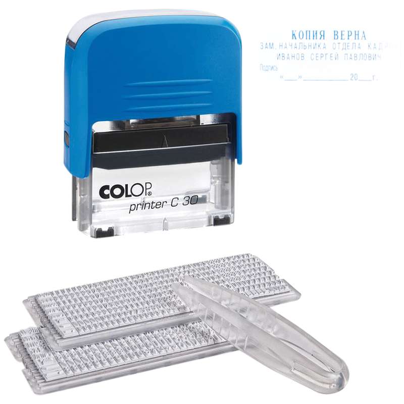 Самонаборный штамп. В комплект входит пинцет и касса букв и цифр. Символы крепятся на одной ножке. Материал корпуса штампа - пластик. Максимальное количество знаков в строке основного шрифта – 29, для выделения текста – 20. В комплект так же входит сменная штемпельная подушка, цвет - синий.Штамп самонаборный Colop, 5стр., 2 кассы, пластик, 18*47мм