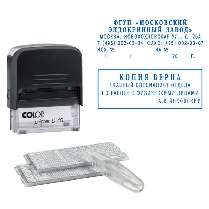 Printer 40N SET- F синий пластмассовый самонаборный штамп с двумя кассами. 6 строк без рамки, 4 строки с рамкойШтамп самонаборный Colop, 6стр. б/рамки, 4стр.с рамкой, 2 кассы, пластик, 23*59мм