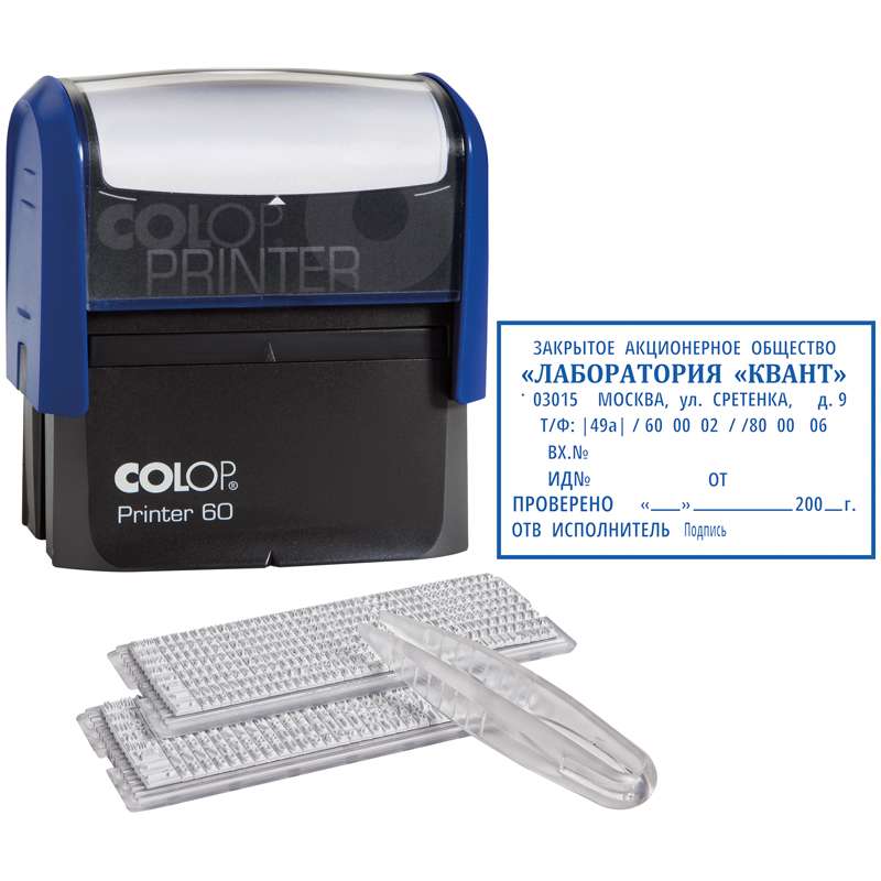 Printer 60N SET- F синий пластмассовый самонаборный штамп с двумя кассами. 9 строк без рамки, 7 строк с рамкой. Размер поля - 76х37 мм.Штамп самонаборный Colop, 9стр. б/рамки, 7стр. с рамкой, 2 кассы, пластик, 76*37мм