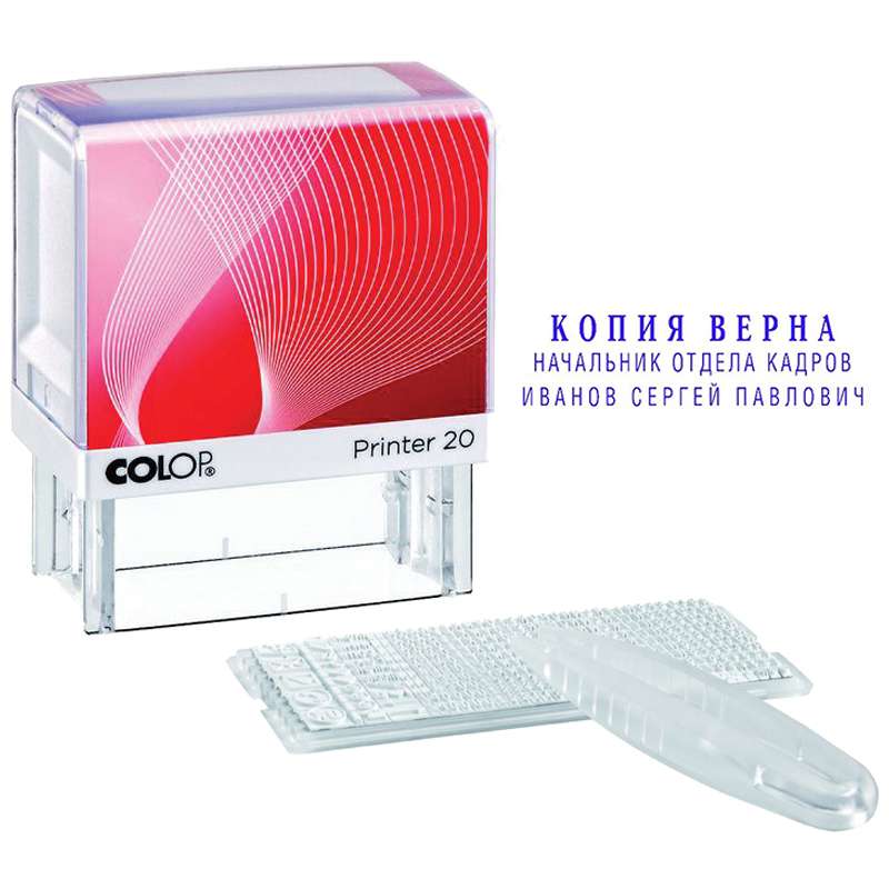 Printer 20 Set пластмассовый самонаборный 4-строчный штамп. В комплект входит пинцет, 1 касса букв и цифр. Размер поля 14х38 мм.Штамп самонаборный Colop, с персонализацией 4стр., 1 касса, пластик, 14*38мм