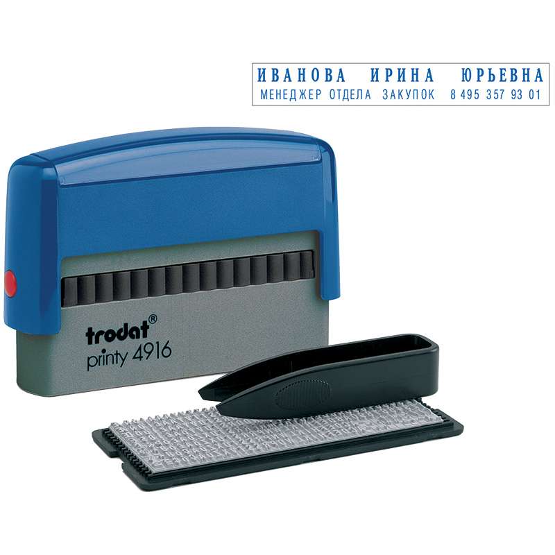 Самонаборный штамп. В комплект входит пинцет и касса букв и цифр. Материал корпуса штампа - пластик. В комплект так же входит сменная штемпельная подушка, цвет - синий.Штамп самонаборный Trodat, 2стр., 1 касса, пластик, 10*70мм