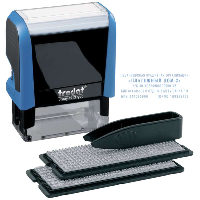 4913 P3/DB – 5-строчный самонаборный штамп. В комплект входит пинцет, 2 кассы букв, цифр и символов 6005 и 6006. Максимальное количество знаков в строке основного шрифта – 35 для выделения текста – 23.Штамп самонаборный Trodat, 5стр., 2 кассы, пластик, 58*22мм